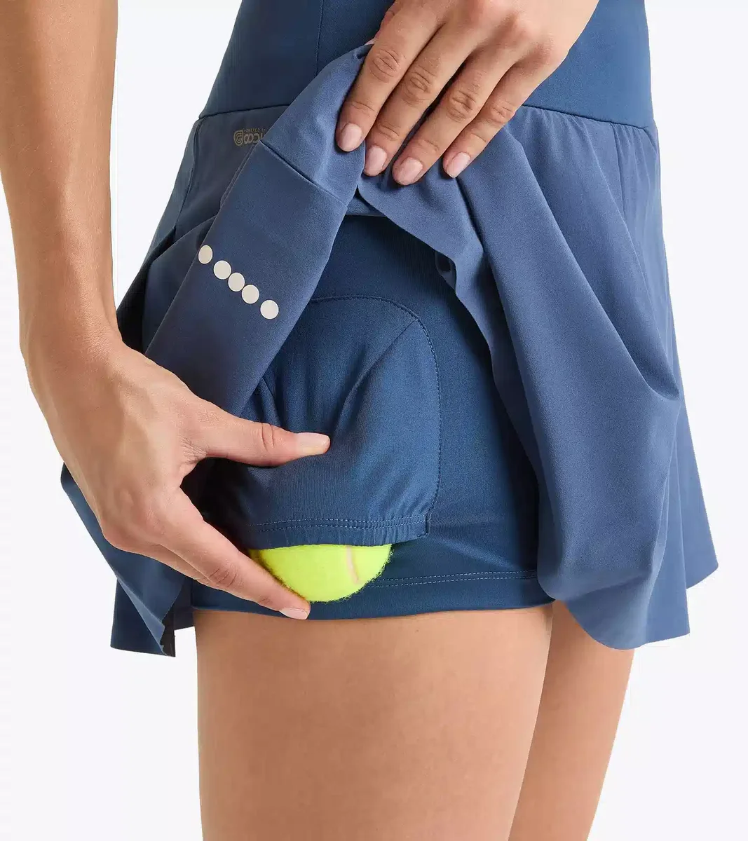 Aceasta este fusta ta de performanță, concepută cu pliuri clare și realizată din țesătură Coolcore reciclată. Compoziția inovatoare ajută la reglarea temperaturii corpului, de la încălzire până la punctul de meci. Păstrează mingile de tenis în pantalonii scurți sub pliuri.