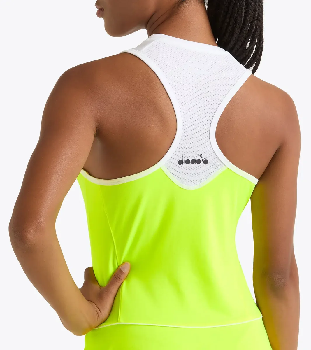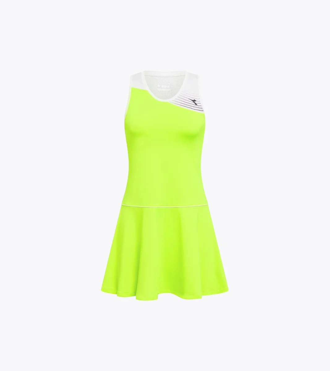 Rochie tip vestă din tricou elastic din poliester moale, cu inserție din plasă pe spate, talie joasă și fustă evazată. Perfectă pentru meciurile și schimburile intense.