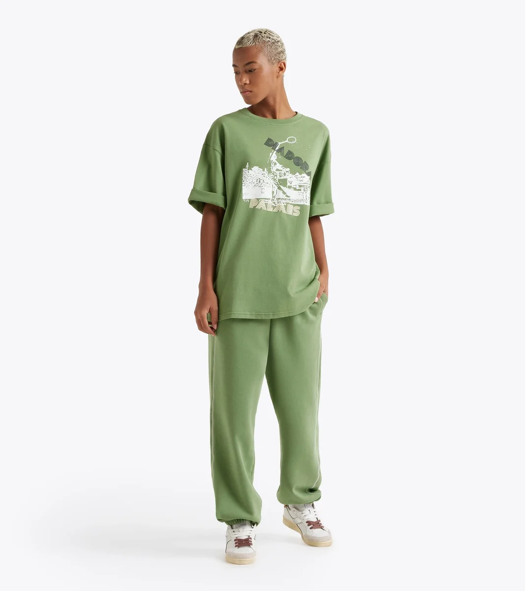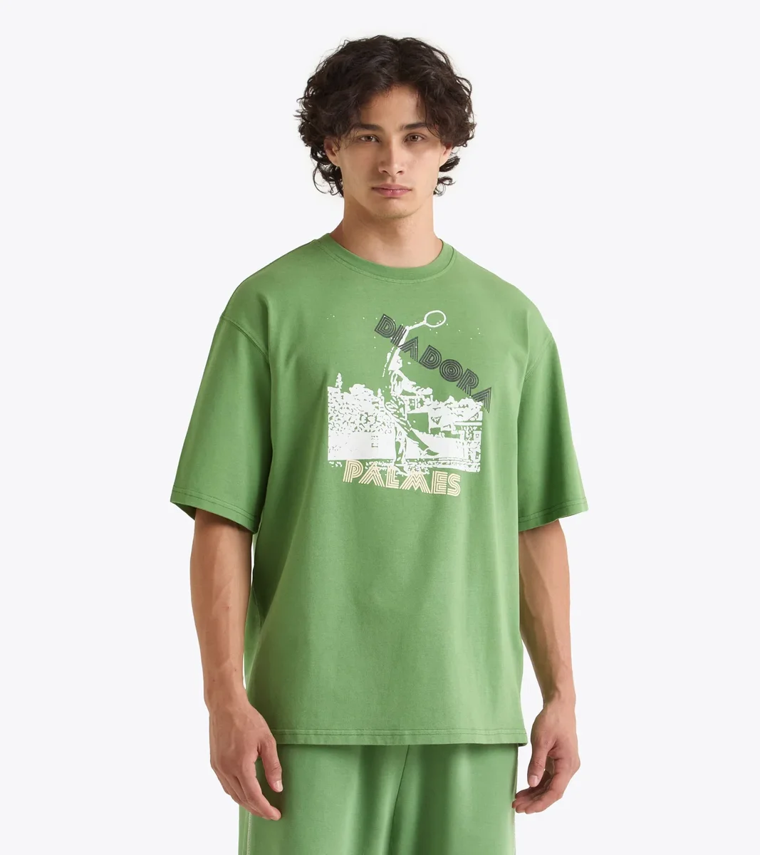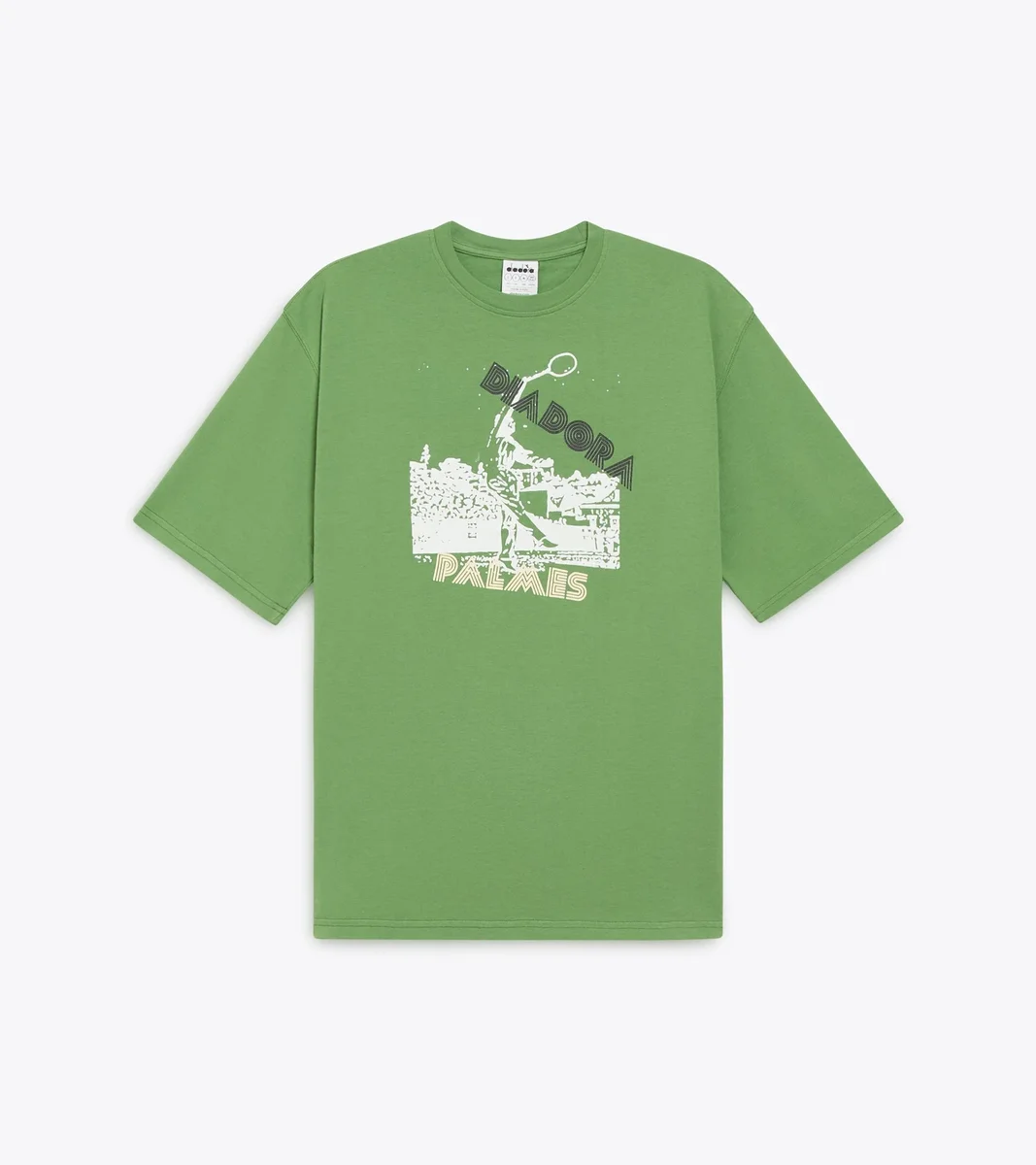 Confecționat din bumbac 100% de 220 de grame, cu un imprimeu serigrafic împrumutat din arhivele noastre, care celebrează colaborarea dintre Diadora și Palmes