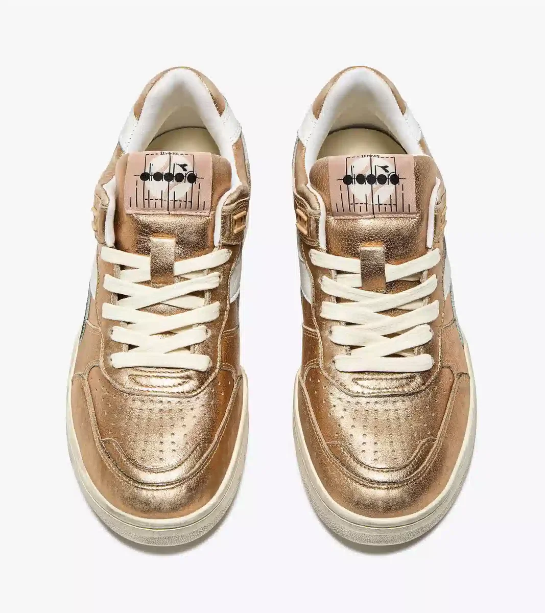 Partea superioară din piele premium și detalii din piele laminată aurie.
