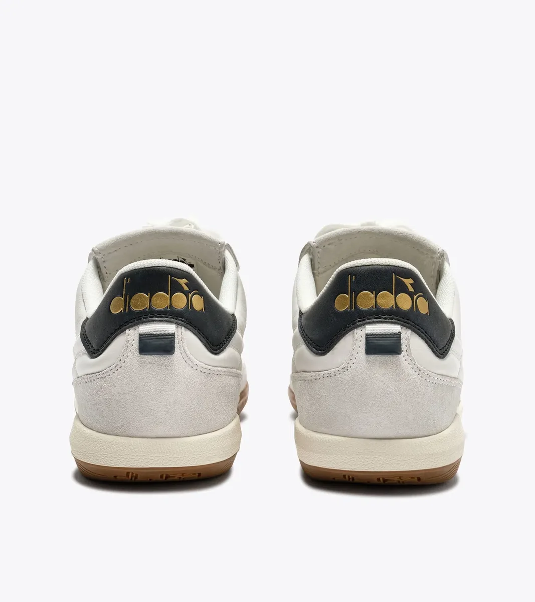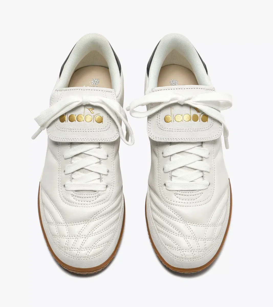 Gold Indoor sunt confecționați din piele moale și piele de porc. Ușor căptușiți, aceștia împrumută limba rabatabilă de la ghetele clasice de fotbal pentru un look rafinat, inspirat din sport. Iar talpa din cauciuc, preluată direct din arhivele Diadora dedicate handbalului, este detaliul pe care îl îndrăgiți încă din anii ’80.