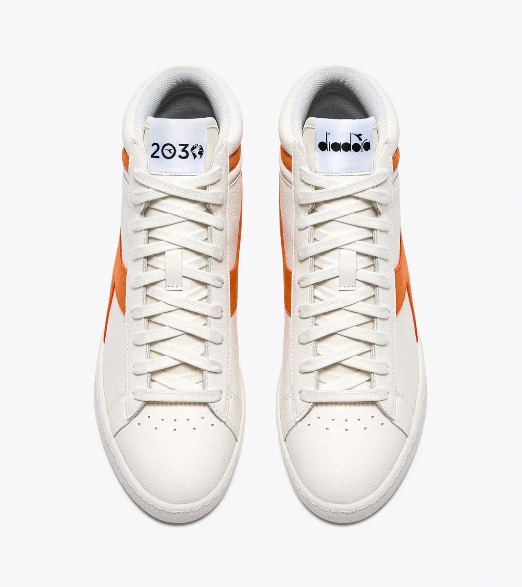 Atractivitatea modelului Game rezidă în estetica sa retro, inspirată din siluetele clasice ale tenișilor Diadora. Această ediție mai durabilă a modelului Game L High este realizată din piele reciclată înainte de consum, poliester reciclat după consum și alte materii prime sintetice. Prezintă un design unisex, cu talpă înaltă.