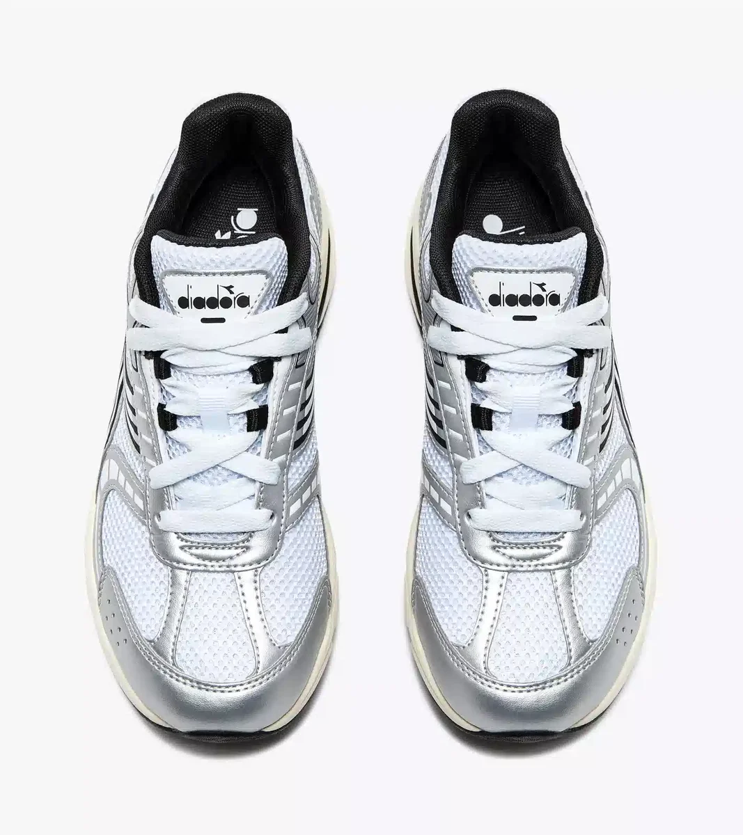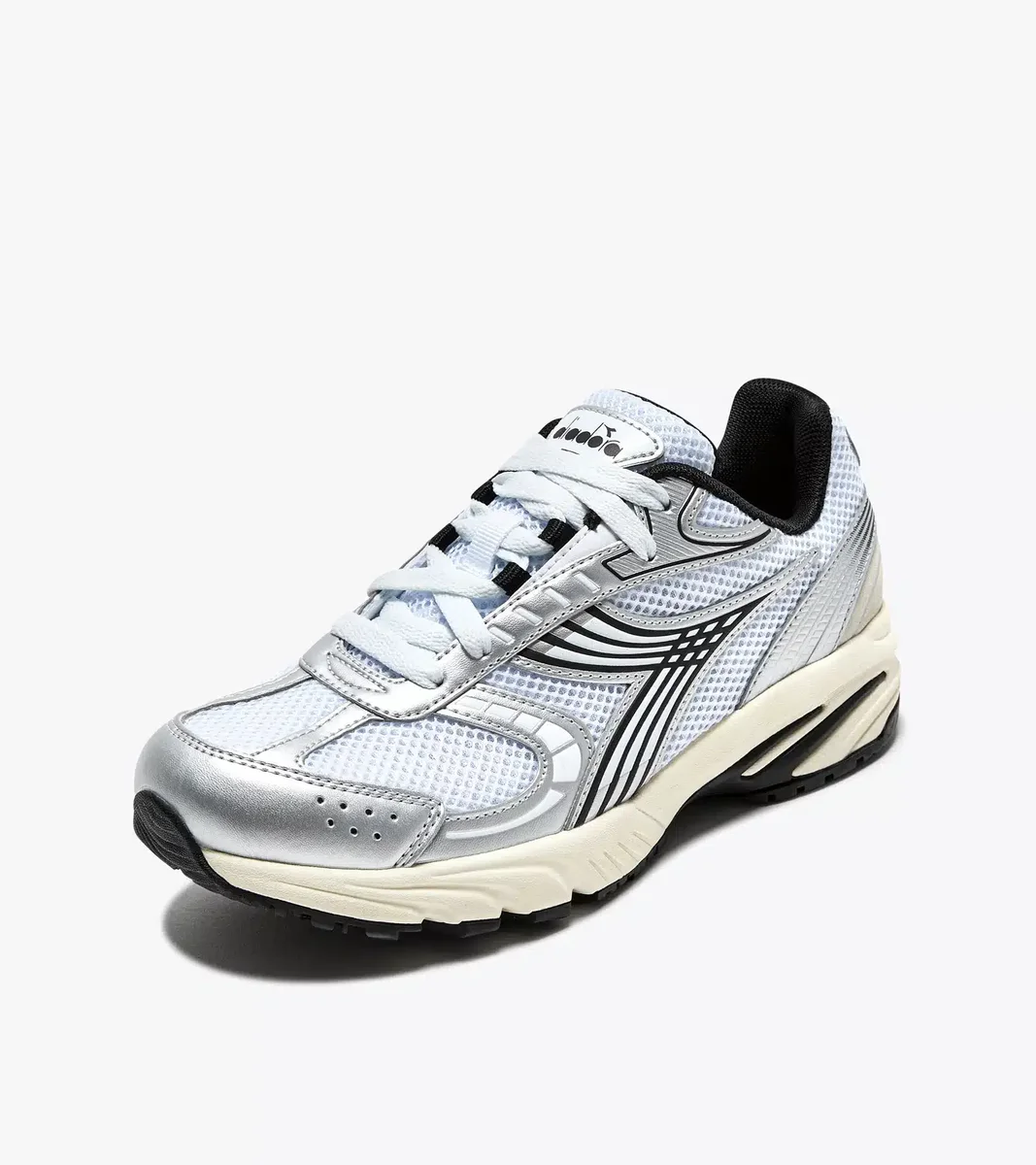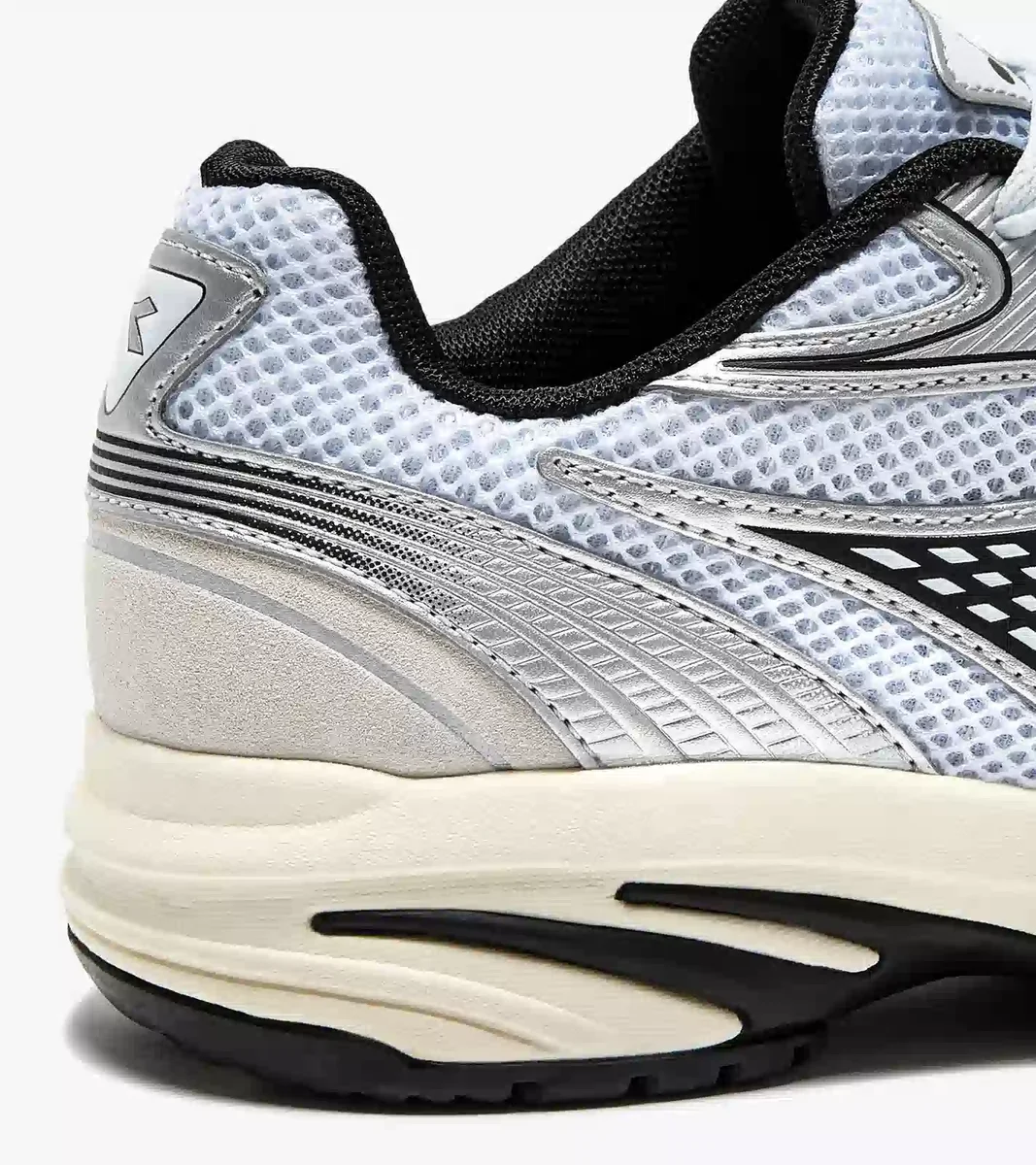 Toate elementele stilului de alergare din anii 2000: parte superioară din plasă deschisă, designul tălpii intermediare și detaliile argintii