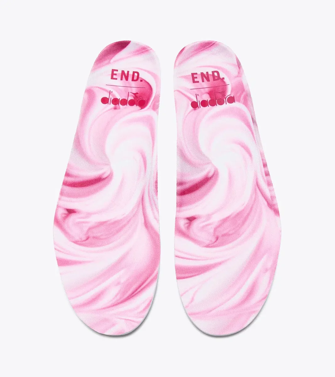 Inspirat de culorile create atunci când căpșunile și smântâna sunt combinate, stilul îmbină estetica alergării din anii ’90 și construcția premium. Asamblat manual în Italia, modelul N9000 este împodobit cu detalii subtile, inclusiv dungi laterale acoperite cu PVC alb lucios, o talpă translucidă cu logo END. personalizat și partea superioară încadrată cu bordură 3M. Logo-ul Diadora ocupă un loc de cinste pe limbă, în timp ce broderia END. de pe călcâi adaugă farmecul ediției limitate. Pentru a completa look-ul, talpa interioară imprimată introduce elemente suplimentare ale temei căpșunilor, iar adidașii sunt livrați într-o cutie de pantofi cu ambele mărci.