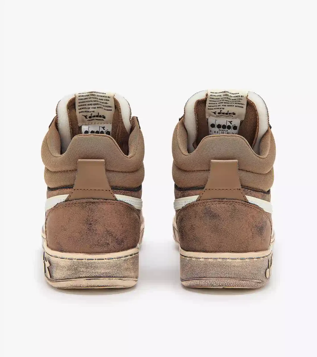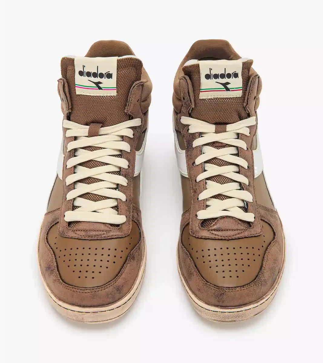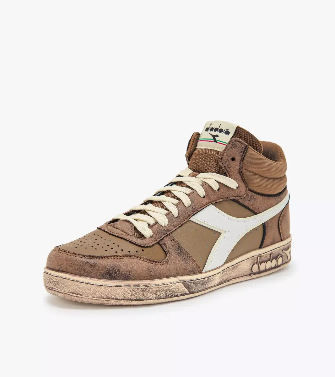 Fie că este vorba de parchetul din arțar sau de betonul străzilor orașului, Magic poate trece de la stilul sportiv la cel streetwear într-o secundă. Aspectul său vintage este inspirat de primii pantofi de baschet Diadora, din anii ’80. Un sneaker unic, Magic Basket Demi Stained este confecționat din piele de vacă, cu efect periat. Talpa are un tratament murdar: un mic detaliu care definește de fapt întregul pantof.
