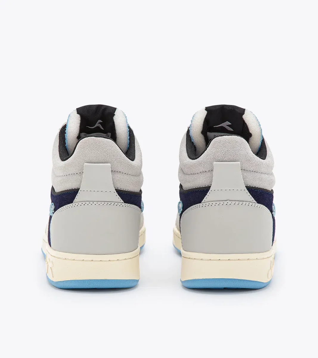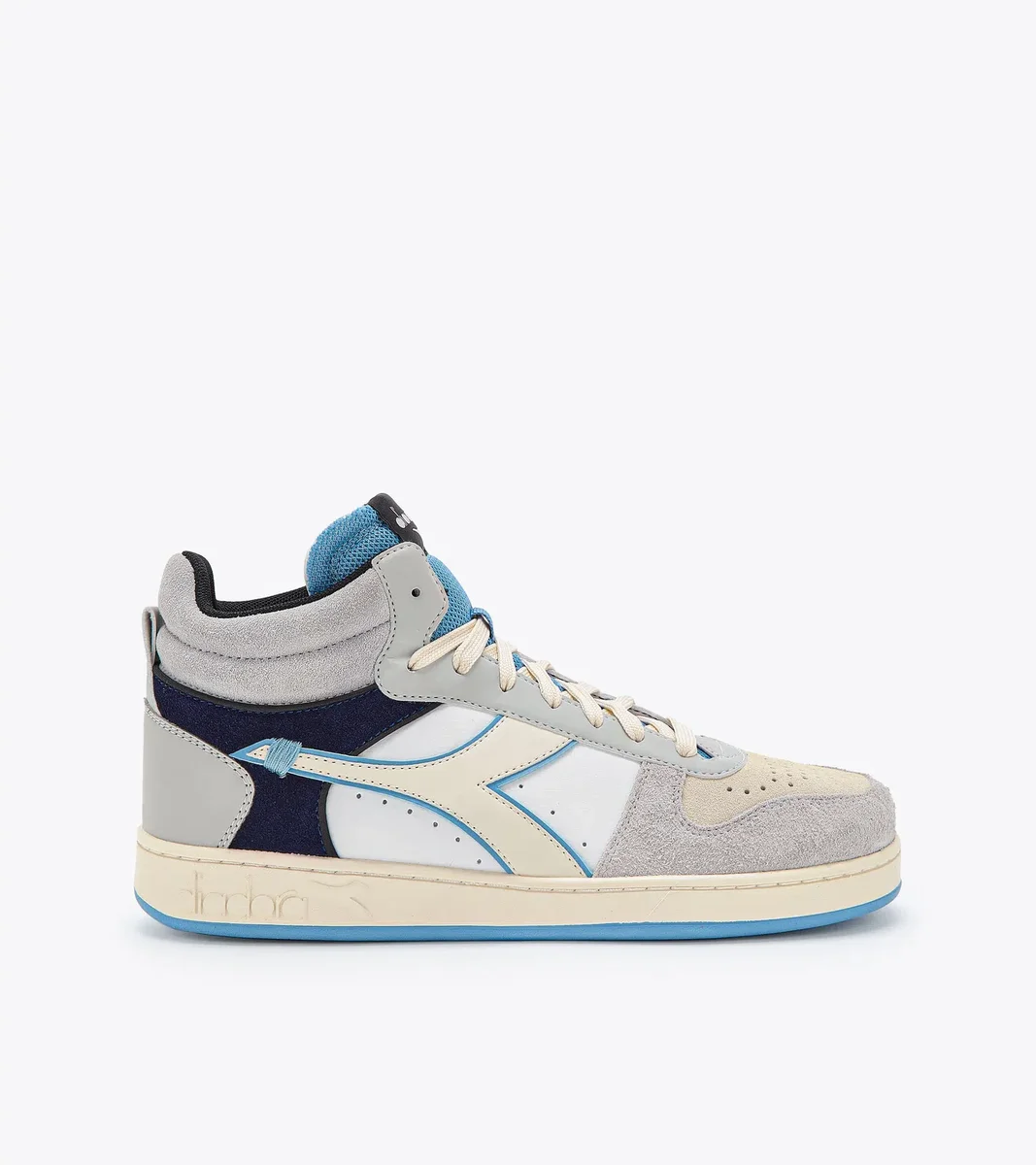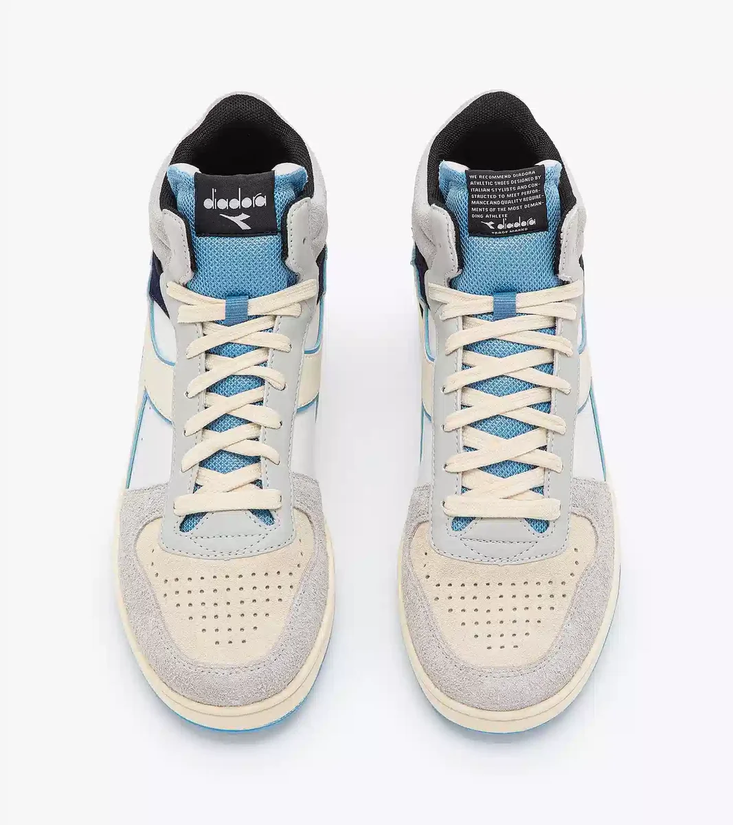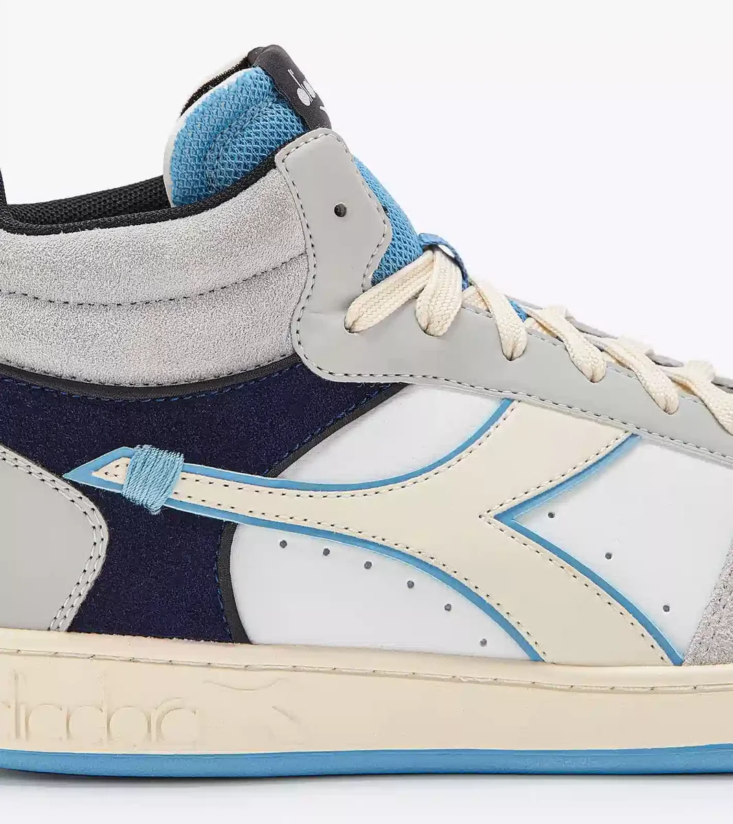 Fie că este vorba de parchetul din arțar sau de betonul străzilor orașului, Magic poate trece de la stilul sportiv la cel streetwear într-o secundă. Aspectul său vintage este inspirat de primii pantofi de baschet Diadora, din anii ’80. Magic Basket Demi Twin este confecționat din piele de vacă și piele de vacă cu păr. Cele două nuanțe de alb murdar sunt foarte bine echilibrate datorită detaliilor albastru deschis de pe Diadora Fregio și talpa exterioară.